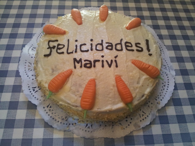 Vamos al grano que a la gran mayoría de los que leéis esta entrada lo que os interesa es la receta y el resumen de todo es que ¡La receta fue un exitazo! Tenía mis dudas porque en casa suelen ser muy tradicionales con los postres (tampoco es que éste sea una innovación en el mundo de la repostería) y no sabía cómo iban a llevar el tema de un postre de zanahorias, pero la verdad es que a la gente le gustó muchísimo. Si a la tarta en sí, le añadimos la decoración y las velas echando chispas … os podéis imaginar.